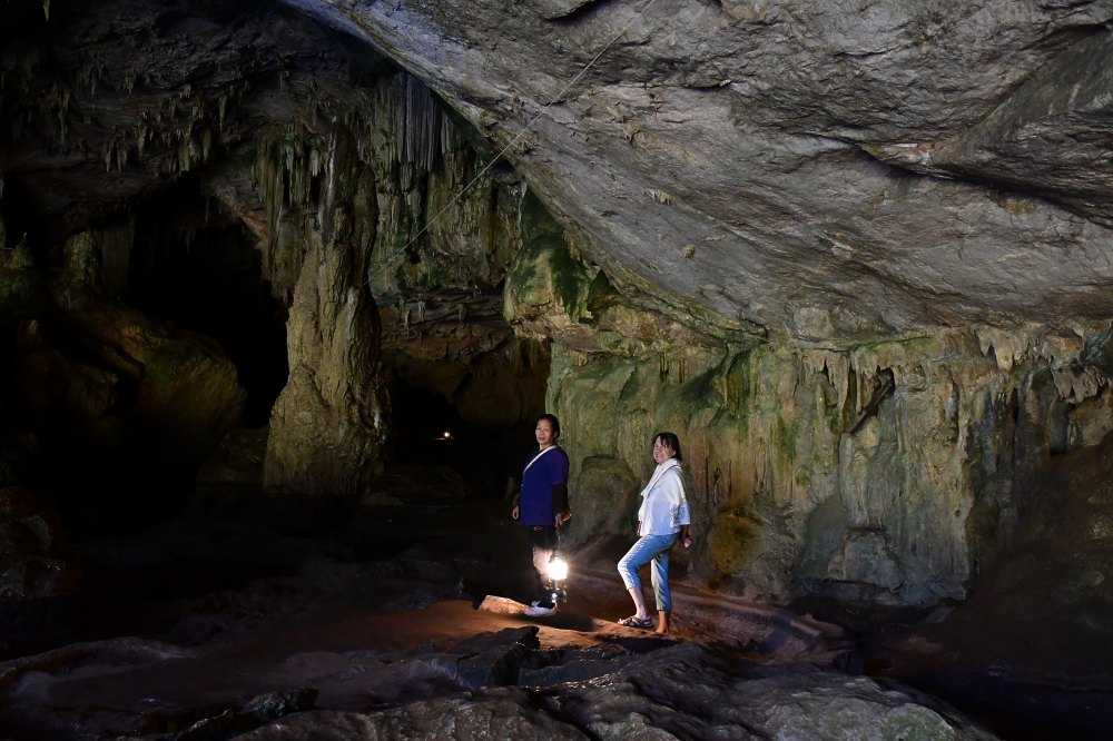 On visite les grottes de Tham Lod accompagnés par une villageoise qui nous éclaire avec une lampe tempête.