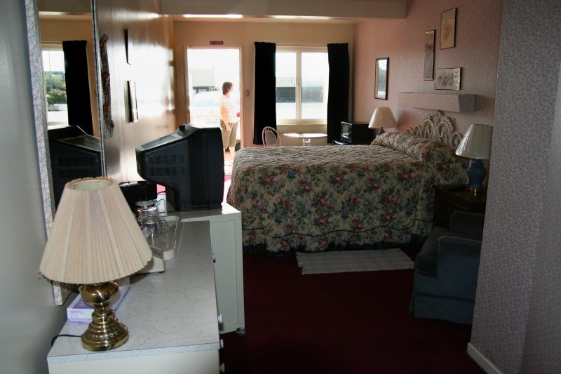 Petit motel typique : machine à café, frigidaire, micro-onde et coin repas.