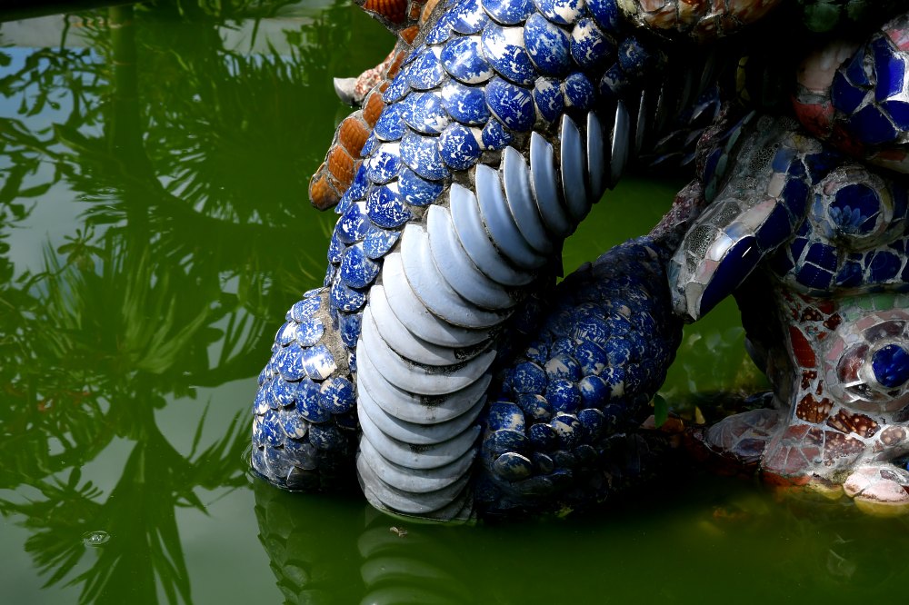 Détail des assiettes et médaillons de céramique qui constituent un dragon.