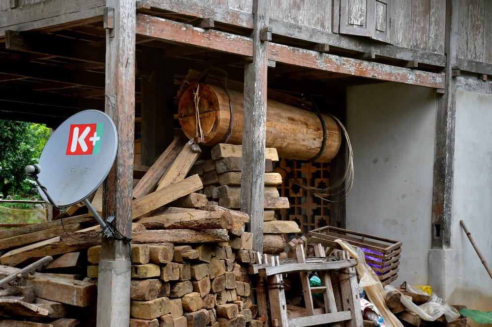 Rencontre de l'ancien et du moderne : l'antenne satellite côtoie le cercueil en attente.