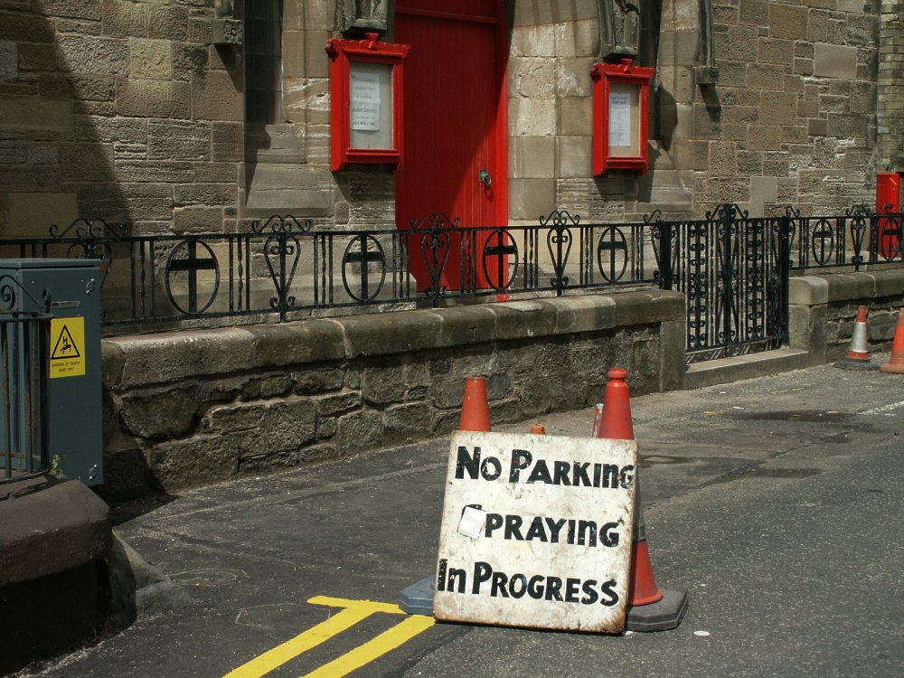 (The message takes its full meaning when you know that the building in front of which the spraying is being done is a church.)