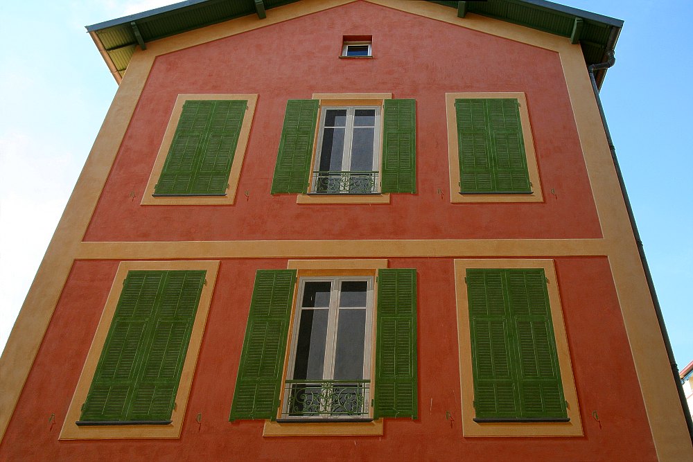 Façade peinte à Villefranche, dans les Alpes Maritimes. Qu'est-ce qui est vrai, qu'est-ce qui est faux ? Réponse : tout est faux.