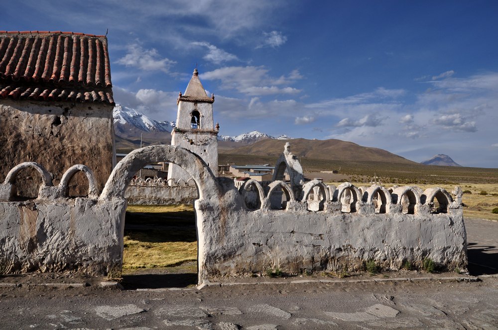 Dans l’architecture religieuse de l’Altiplano, l’église et le clocher sont toujours deux bâtiments séparés. L’un représente le monde terrestre, l’autre l’empire céleste.