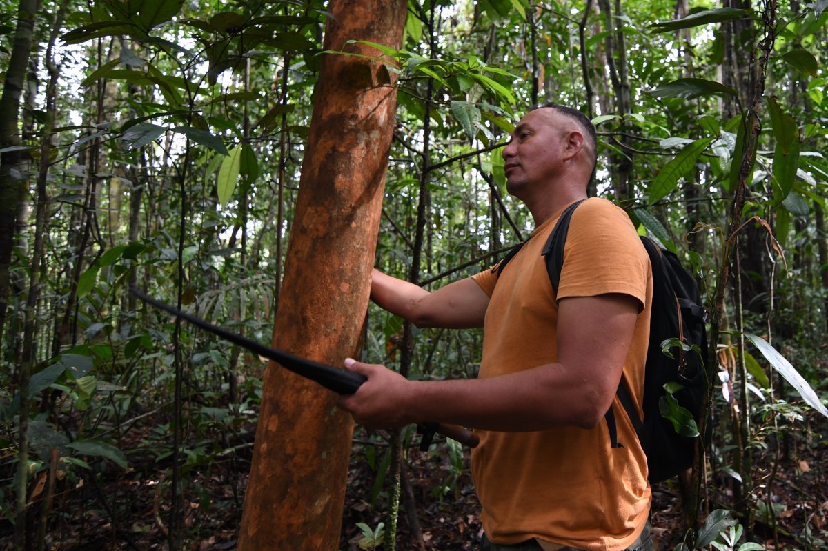 Raphaël nous montre un grand tronc lisse. C’est l’andiroba. L’arbre produit des fruits à coque contenant une douzaine de graines. Elles sont cuites et pressées pour en extraire l’huile, une huile miracle, à la fois cicatrisante, et anti-inflammatoire.
