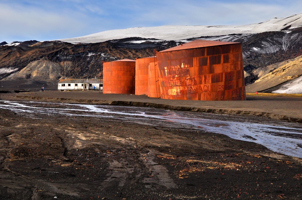 Citernes avec, en fond, le bâtiment principal de l’administration anglaise, tel qu’il a été transporté par une coulée de boue.