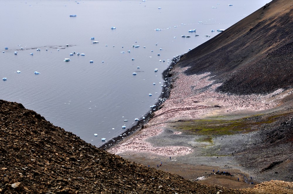 La colonie de manchots adélie, vue du sommet de l’île. Remarquez le défilé de manchots se dirigeant vers la mer.
