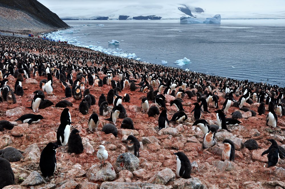Notez la présence du "grand bec" (oiseau blanc) et le regard inquiet des quatre manchots qui l’encadrent.