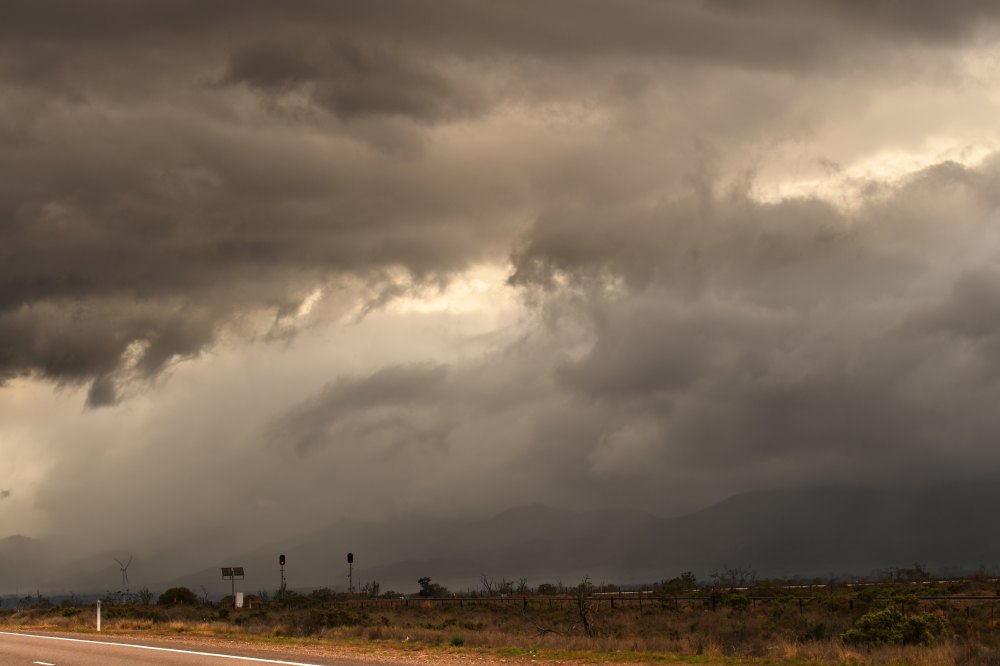 7h30: le jour se lève à peine, c'est vraiment l'hiver ici. Quelques rangements dans le van pour y circuler plus facilement, petit déjeuner succint (j'ai oublié le café hier) et nous reprenons la route avec l'arrivée des paroissiens prêts pour la messe. Après Port Pirie, la chaîne des Flinders, sur notre droite, bloque les nuages qui s'accumulent en masses noires, grises et blanches.