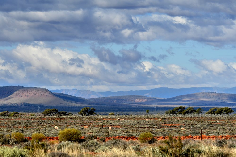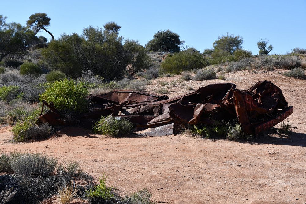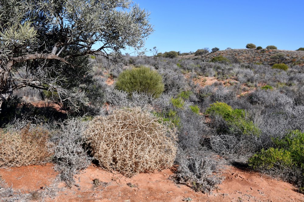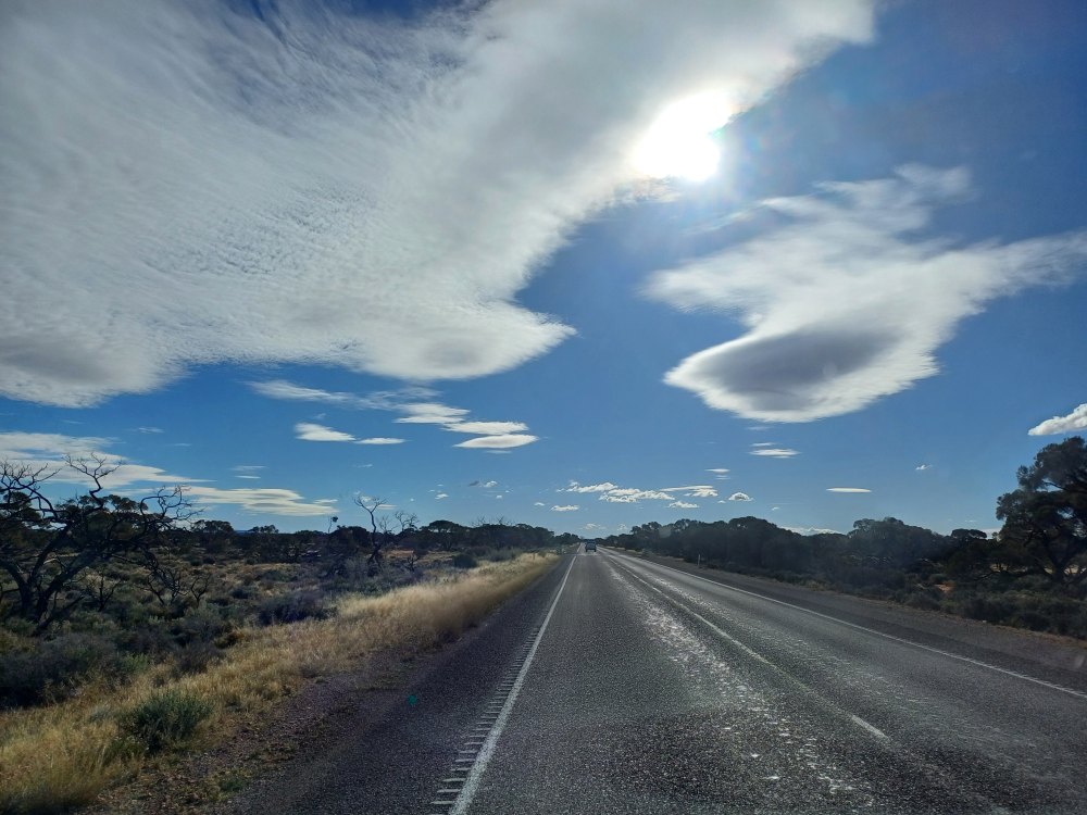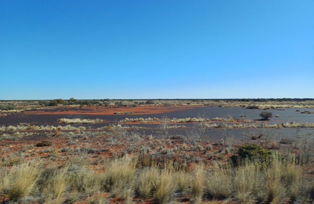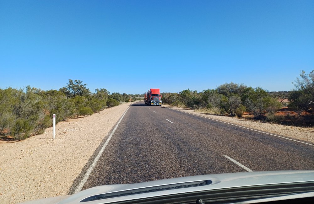 Ce matin le ciel est complètement dégagé et il fait moins froid. Petit arrêt à la Spud Roadhouse pour acheter une carte routière de l'Australie centrale. La plaine est couverte de petits buissons et, au loin, nous apercevons quelques collines. Sur la route nous croisons nos premiers roadtrains à trois ou quatre remorques. Nous nous arrêtons au bord du lac Hart, un lac salé où ont encore lieu des tests militaires.