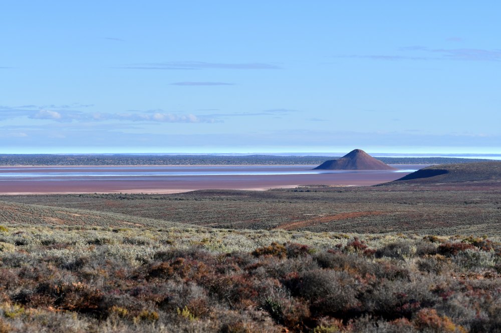 Au loin, comme un mirage, de l'eau sur un fond de terre rouge et comme un terril qui se dresse. C'est Pernalty Lagoon.