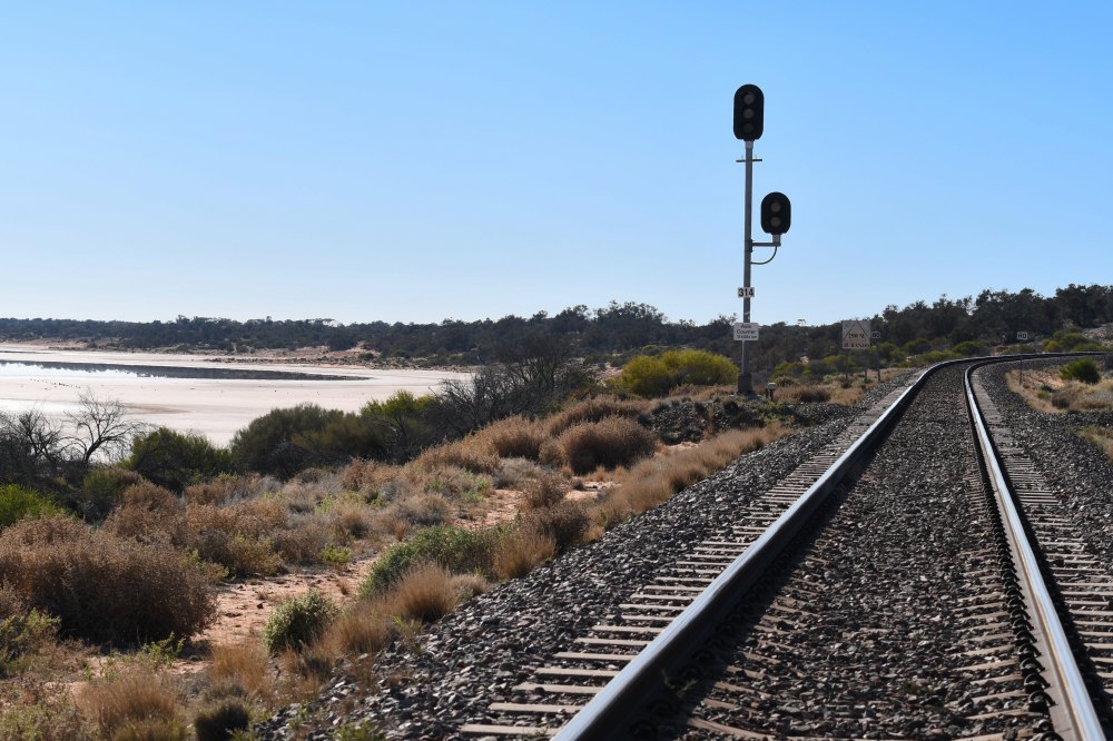 Par endroits on dirait que le sol a été goudronné: il est noir et brillant sous le soleil. En réalité ce sont de petits cailloux noirs, posés sur le sol rouge, sans doute du minerai de fer. Pour la première fois nous longeons la voie ferrée qu'emprunte chaque semaine le Ghan pour aller d'Adélaïde à Darwin.