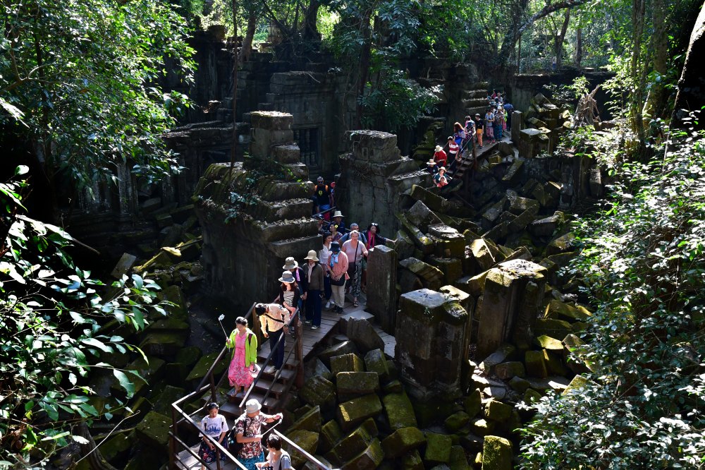 Les nombreux groupes de touristes défilent comme des intrus sur les passerelles du labyrinthe du site.