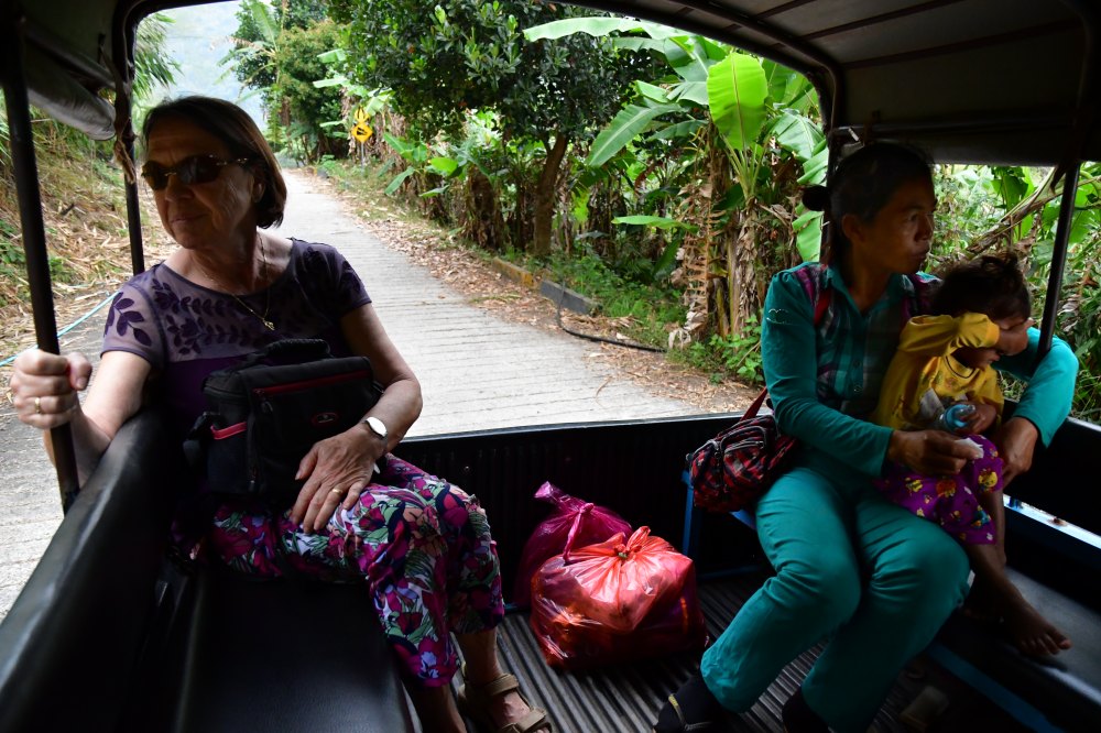 La pente est si forte qu'il faut s'accrocher aux montants du pick-up.