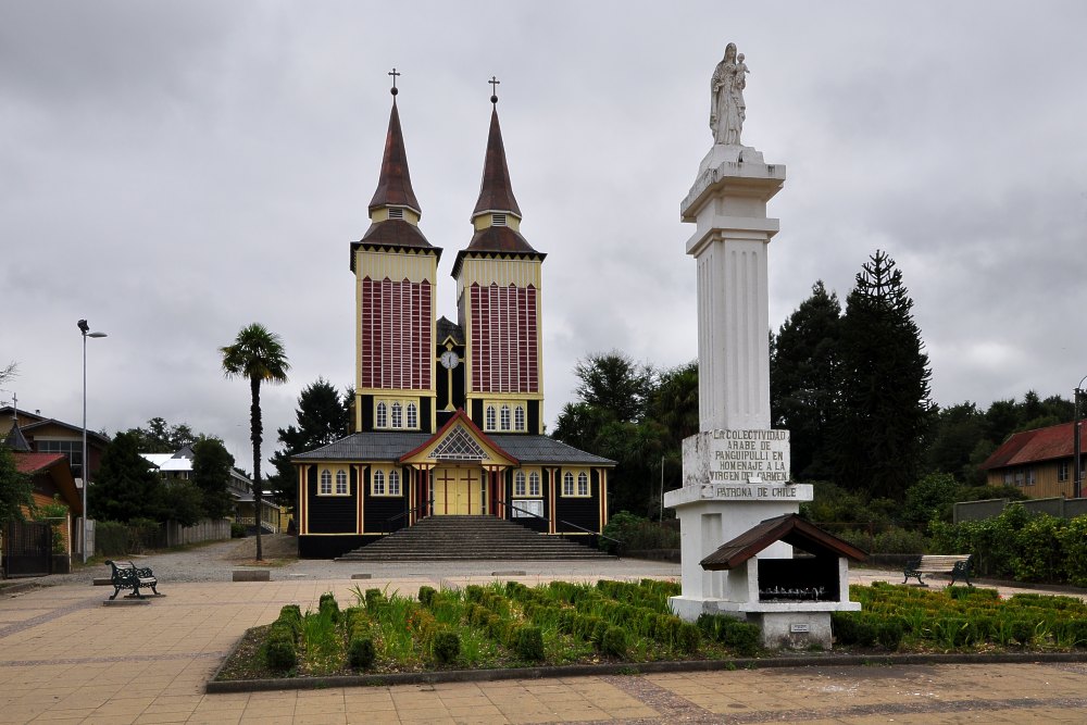 L'église de Panguipulli. Inscription au pied de la Vierge de Carmen, patronne du Chili : La collectivité arabe de Panguipulli en hommage à la Vierge.