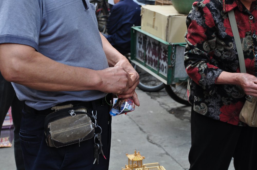 Le vendeur emballe dans un cornet en papier l’oiseau que vient d’acheter la dame à droite.
