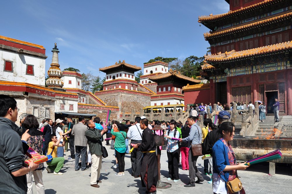 Une image un peu fouillis mais riche de contenu. A gauche, le pèlerin qui vient d’acheter une boite de bâtons d’encens. Au centre, le moine qui les vend. Entre les deux, un autre pèlerin lève vers le bâtiment où se trouve le bouddha géant ses bâtons en feu. A droite, une dame va placer les siens dans l’incinérateur qui brûle derrière elle. Autour, la foule des touristes chinois.