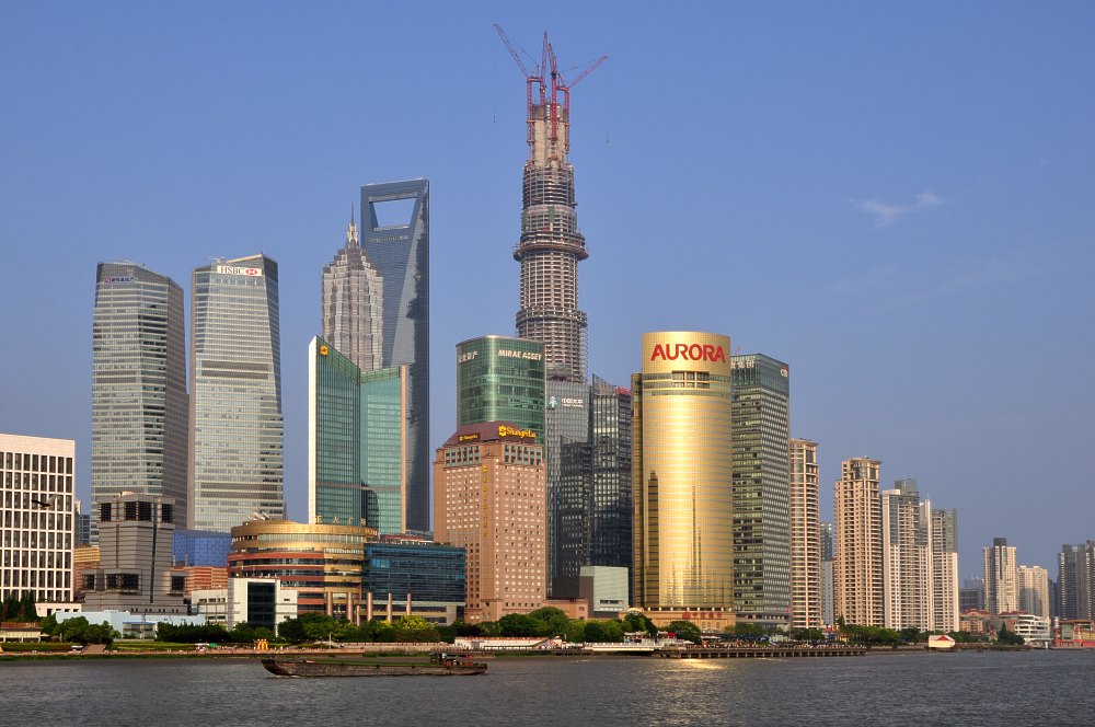 Course vers les sommets. A gauche, les deux tours du Shanghai International Finance Centre. Plus haut, la Tour Jinmao, 420m. Puis le Shanghai World Financial Center (le décapsuleur), 492m et enfin le Shanghai Center et ses 632m.