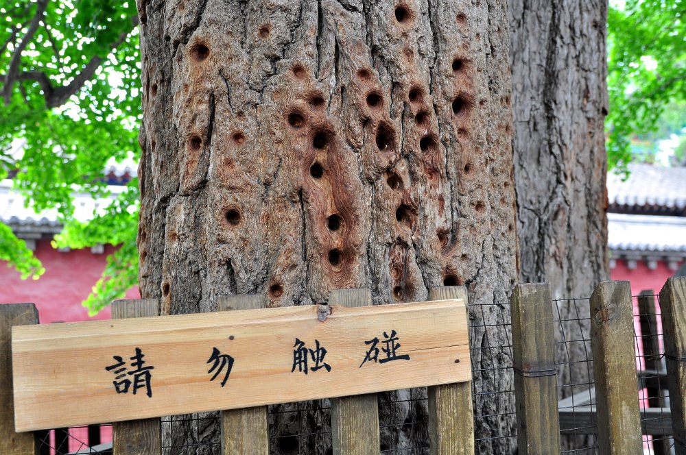 Trace des "coups de doigt" laissés dans l'écorce par les adeptes du kung-fu.