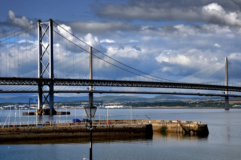 Le pont autoroutier (Forth Road Bridge) avec, immédiatement derrière, la voilure du Queensferrycrossing. Le Queensferrycrossing supporte l'autoroute M90. Le Forth Road Bridge supporte la route nationale A90.