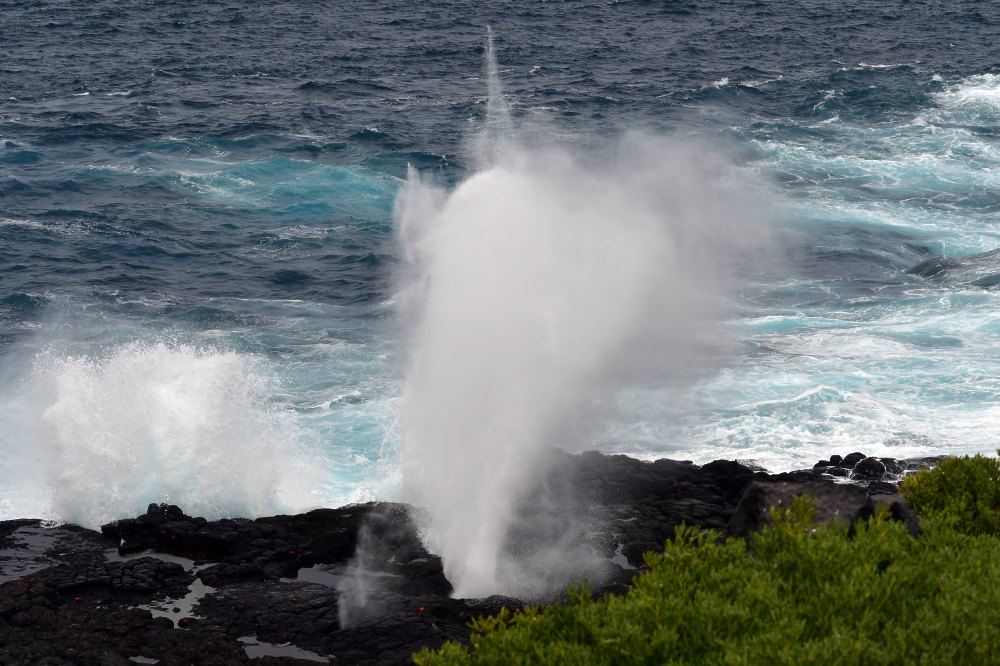 Le "trou souffleur" est une formation naturelle qui crée un geyser d'eau d'une vingtaine de mètres de hauteur quand la mer s'engouffre entre les rochers.