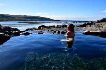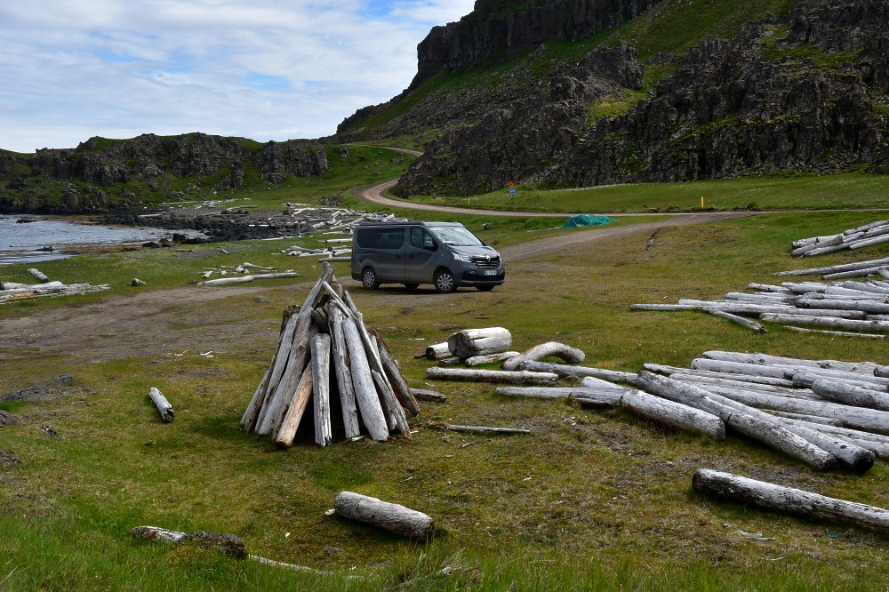 6h30, 7°, grand soleil et vent fort. Premier lavage du camion qui en a bien besoin. Découvrons un adorable hot pot en bord de mer, 38°, solitude et soleil. Le rêve. Coupons par la 61 vers Holmavik et faisons le tour de la petite péninsule de Drangsnes : bois flotté venant de Sibérie, sternes et huîtriers pies le long de la baie d'Hunafloi. Camping basique à Bordeyri, face au Hrutafjördur : 2000kr, 2 toilettes. Pas de pluie aujourd'hui encore.