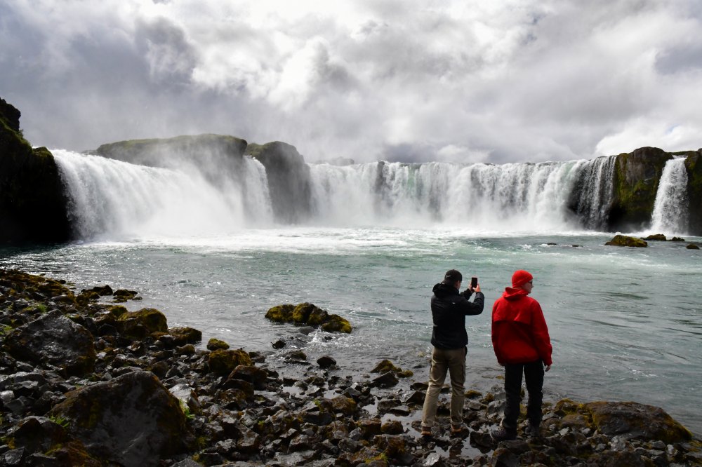 Hier soir nous nous sommes arrêtés à Holar, sur la péninsule des Trolls. Petit camping basic au milieu des pins, avec des emplacements adorables (3000kr). 8h, 11°, gros nuages. Sur la côte du Skagafjördur, la pluie commence à tomber. Siglufjördur, visitée l'an passé, heureusement car il pleut à seau, tunnels vers Olafsfjördur dont un est à une voie, un peu stressant. Sortie du tunnel, surprise, tout est sec. Godafoss : le soleil joue à cache-cache au dessus des chutes que l'on peut admirer des deux côtés. Reykjahlid, au bord du lac Myvatn. Arrêt au camping Bjorg, (8000kr pour 4 nuits) très bien situé au bord du lac mais avec peu de places pour les camping cars. Réservons un circuit vers l'Askja pour après-demain, où il devrait faire beau.