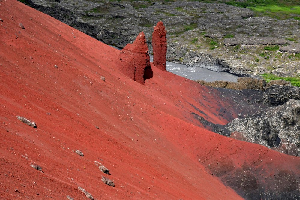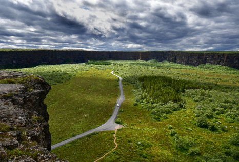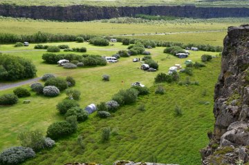 Tour de la péninsule de Tjörnes, puis gorge d'Asbyrgi et randonnée (4,5km) sur l'affleurement rocheux de l'Eylan. Descendons ensuite par la 862, non asphaltée, vers Vesturdalur. Très belle randonnée (8,5km) vers Hljodaklettar où roches en accordéon et colonnes de basalte horizontales renvoient les sons de façon improbable puis vers les cônes de cendre rouge des cratères du Raudholar. Camping, 3100kr, à Asbyrgi. Pas de cuisine ni de salle commune. Douches payantes, lave-linge et placards séchants, nombreux emplacements dans un beau cadre.