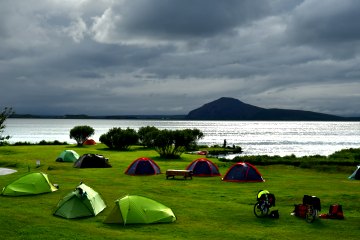 Retour vers Reykjahlid. Le ciel se couvre et nous avons droit à des nuages fantastiques. Route 87, en partie en réfection puis 85 jusqu'à Husavik. Petit camp, 2000kr, petites installations, beaucoup de monde et de bruit.