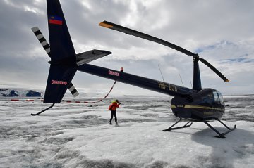 8h, 10°. Départ pour Mödrudalur, la plus haute ferme d'Islande où nous voulons réserver un vol en hélico. Le ciel est complètement dégagé et le pilote est libre pour 10h30. Quelle chance! Trois heures pour survoler l'Herdubreid, la caldeira d'Askja, le champ de lave du Bardarbunga, le Vatnajökull (où nous faisons un arrêt pour nous promener sur le glacier), les lagunes glaciaires du sud, le mont Snaefell, le barrage de Karahnjukar, les fjords de l'est avant de revenir par le Fljotsdalsheidi, gigantesque étendue de toundra humide parsemée de petits lacs. Expérience époustouflante.