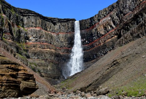 Il a plu toute la nuit. 8h, 12°5. Petit arrêt à Burstafell, manoir au toit de tourbe datant du XVIII siècle. Paysage de toundra sous les arcs en ciel. 14h, 20°, il n'a jamais fait aussi chaud. Montons à Hengifoss qui dévale de 128m au fond d'un cirque brun et rouge après avoir longé Litlanesfoss qui elle tombe entre des orgues basaltiques. Route vers le barrage de Karahnjukar, la gorge d'Hafrahvammgljufur avec de belles vues sur le mont Snaefell et le glacier Bruarjökull. Camping d'Höfdavik sur les rives du lac Lagarfljot. Beaucoup de monde et peu de commodités.