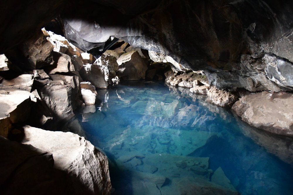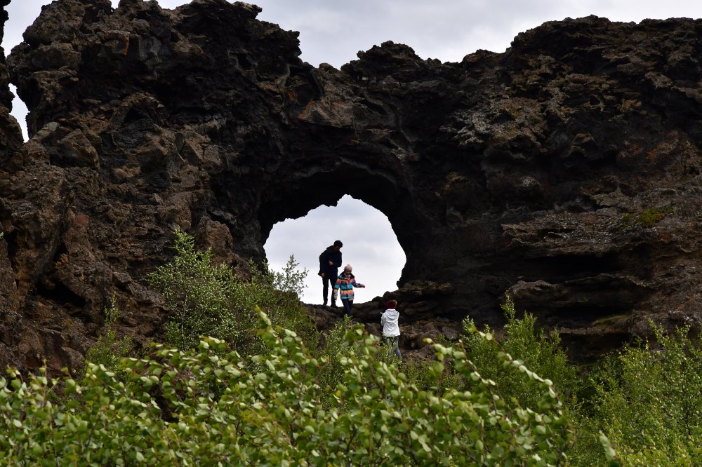 1h13, le soleil se lève. Les nuages ont disparu. 8h, 9°, ciel bleu parcouru de gros nuages. Nous faisons le tour du lac par l'est en commençant par le tour du Hverfell, cône de téphra de 463m de haut sous un vent tellement violent que l'on peine à tenir debout. Ensuite, champs de lave de Dimmuborgir, aux formations étonnantes, promontoire de Höfdi, pseudo-cratères de Skutustadir et retour par la route circulaire en finissant par Grjotagja, une faille ouverte avec une grotte remplie d'une eau bleue à 45°. Une autre journée sans pluie, malgré le vent et les nuages.