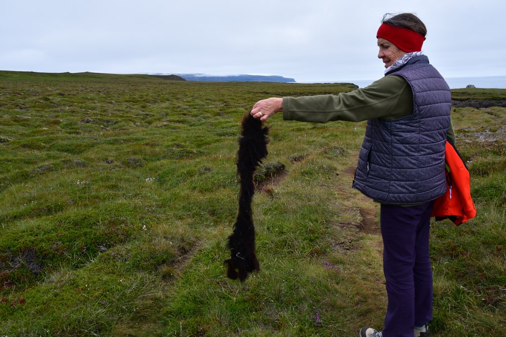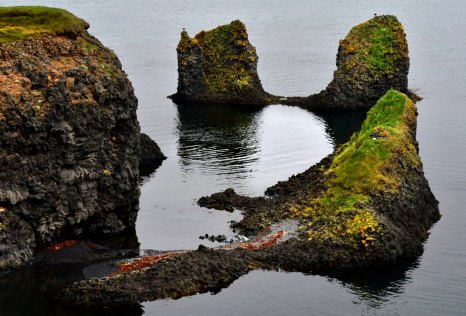 9h, 13°, ciel voilé. Longeons l'Oxarfjördur vers Kopasker, puis coupons par la 85, non goudronnée, pour rejoindre l'est de la péninsule et Raudanes. Randonnée de 3h sur les falaises découpées et creusées de grottes et d'arches où s'abritent de très nombreux oiseaux. Dommage que le chemin du retour n'ait aucun intérêt. Arrivés au bout de la péninsule, il vaut mieux revenir sur ses pas.