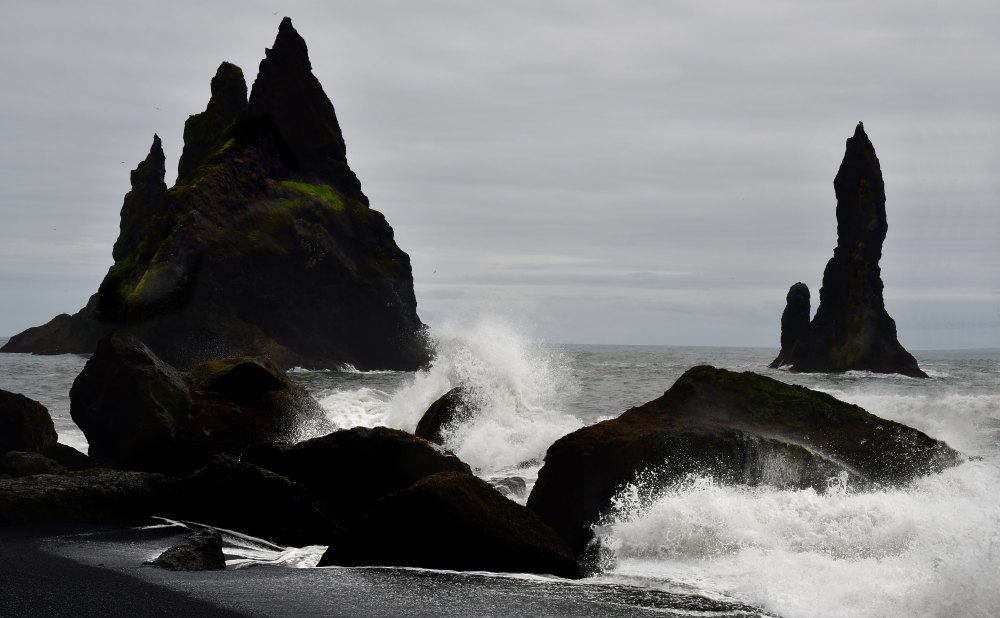 Les rochers de Reynisdrangur vus de la plage de Reynisfjara.