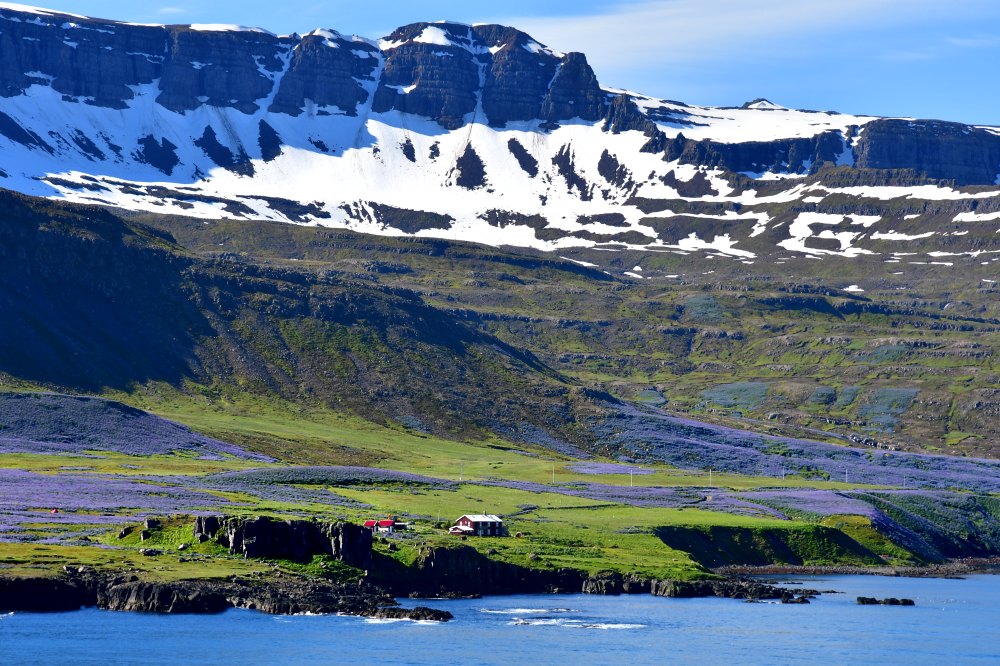 Arrivée. Des tapis de lupins couvrent les pentes du fjord.