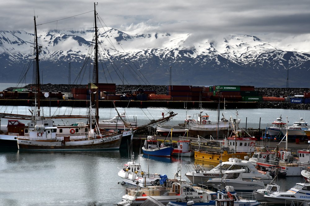 De l'autre côté de la baie se dressent les montagnes encore enneigées à la fin mai de la chaîne du Viknafjöll.