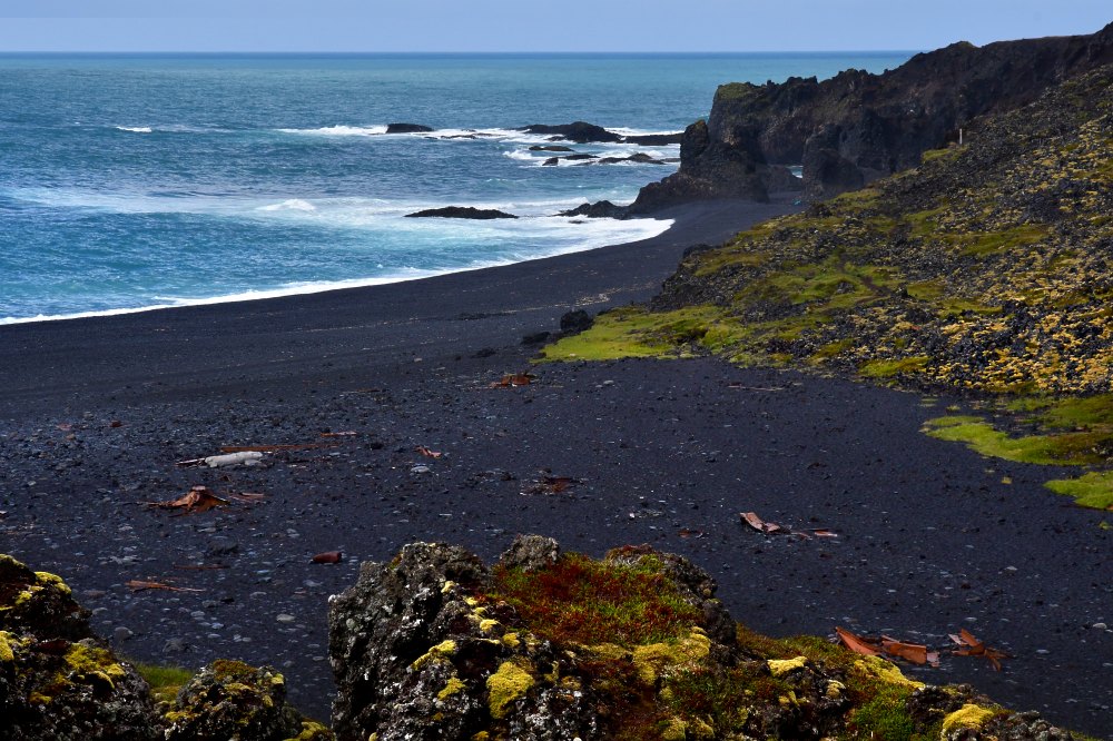 De l'autre côté du promontoire, les ruines de Dritvik, autrefois le plus grand port d'Islande, se dressent entre la plage de sable noir et les champs de lave.