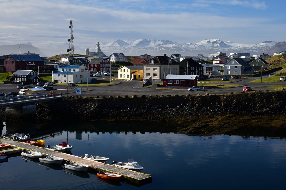 Stykkisholmur est dominé par les pics enneigés de la chaîne du Kerlingarfjall.