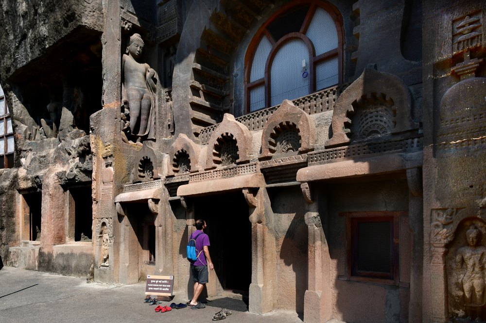 Entrée de la grotte 9, une des plus anciennes, datée du IIe siècle. La façade est ornée de fenêtres et de décorations ajourées. Les grandes statues de Bouddha sont des ajouts du V siècle