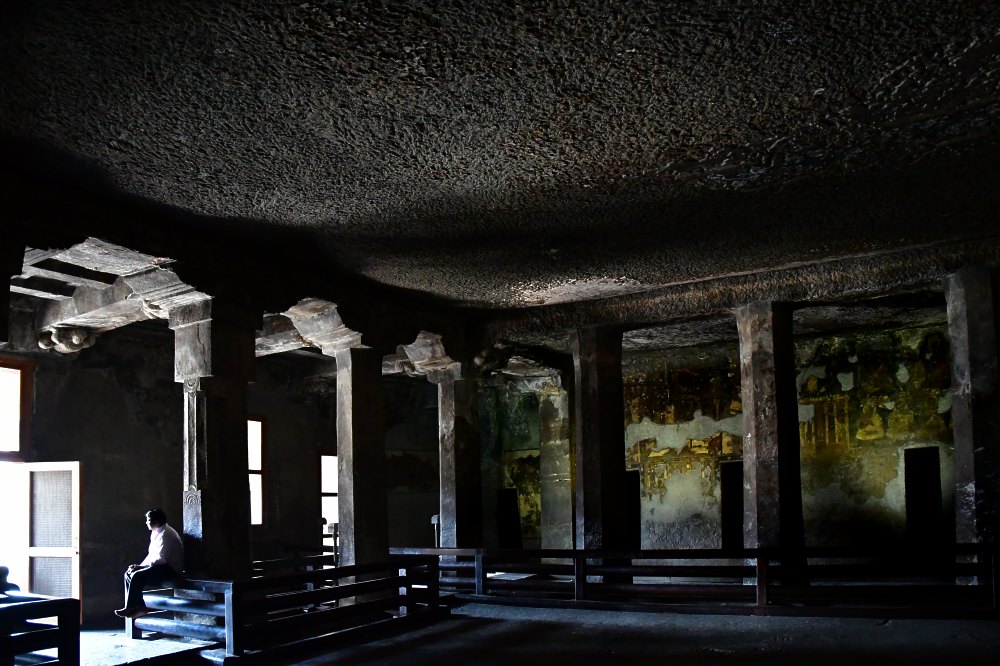 La grotte 16 est un monastère. Deux éléphants encadrent l'entrée extérieure.