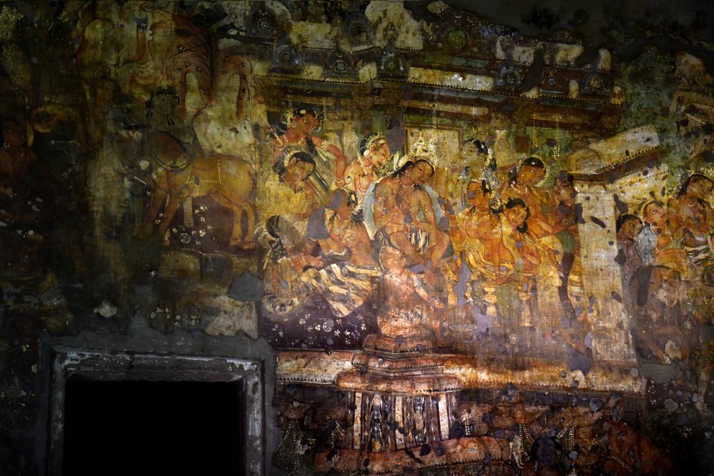 L'intérieur de la grotte est très sombre et l'éclat des lampes torches des guides vient parfois perturber la vision idyllique des scènes de la vie quotidienne qui couvrent les murs.