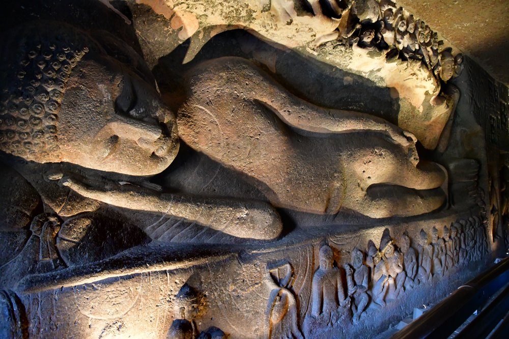 Représentation du Parinirvana: Bouddha gisant de 7m de long.