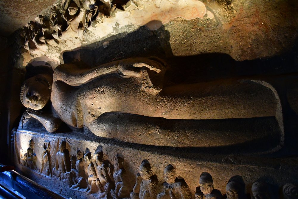 Sous Bouddha, ses adeptes pleurent son départ. Au-dessus les "anges" se réjouissent de son arrivée.