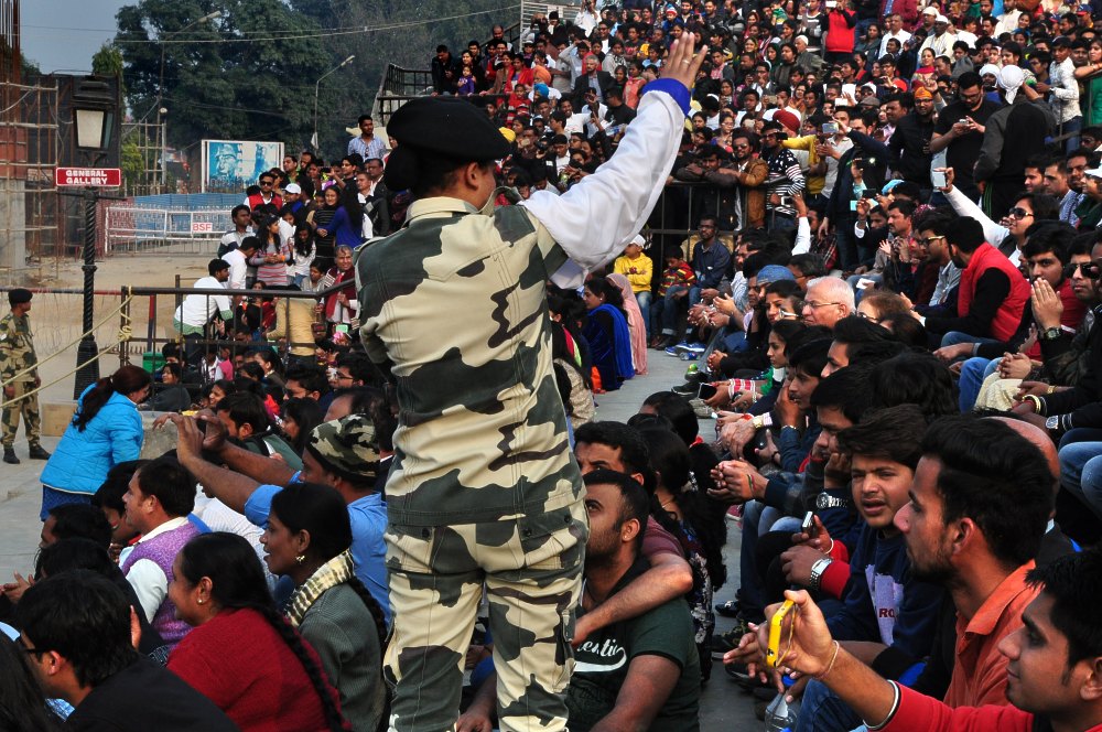 Tous les soirs sans exception une foule bigarrée se dirige vers la petite ville de Wagah à 30 km d’Amritsar. On y vient de l’état du Penjab mais aussi de l’Inde toute entière. Pour les locaux c’est l’endroit où on se rend en famille, pour les Indiens c’est la chose qu’il faut voir une fois dans sa vie. Qu’y a-t-il à voir à Wagah ? Rien justement. C’est le point de passage où l’on ne passe pas. C’est une barrière close que l’on ferme avec cérémonie tous les soirs. Et qu’y a-t-il de l’autre côté de la barrière ? Le Pakistan où on mène à la même heure une cérémonie rigoureusement identique.