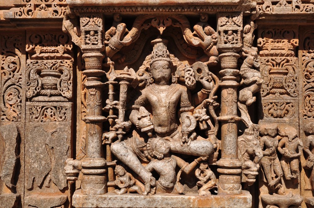 Bas-relief de Vishnou, tenant dans ses quatre mains la roue, symbole de mouvement, une massue, symbole d’autorité, une conque, symbole d’espace infini et une fleur de lotus.
