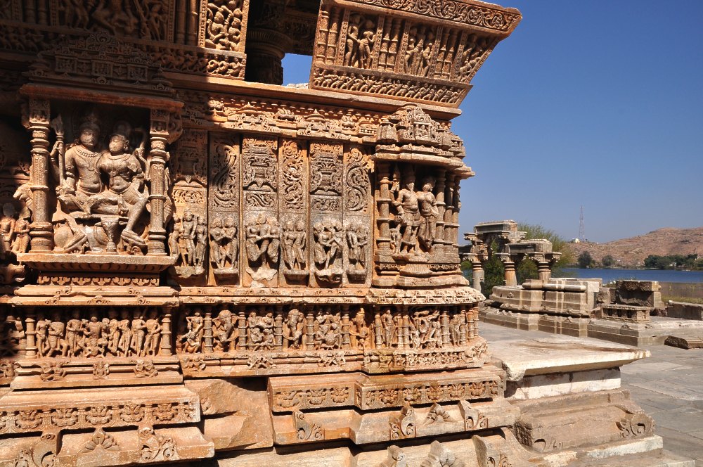 Bas-relief extérieur du Saas Temple représentant des couples amoureux.