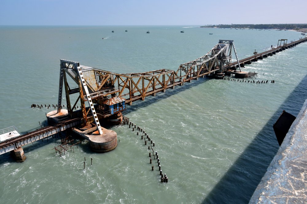 Longeant le pont routier, la voie de chemin de fer mène à l'île de Rameshvaram.