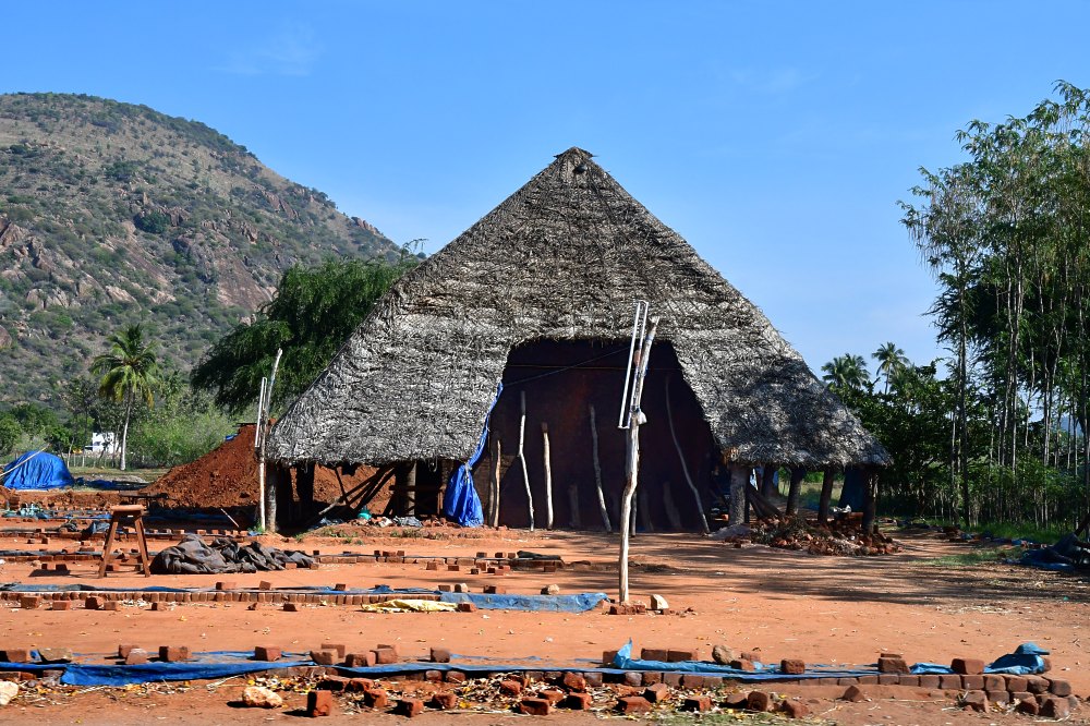 Four à briques, protégé par un grand toit de chaume au Kerala.