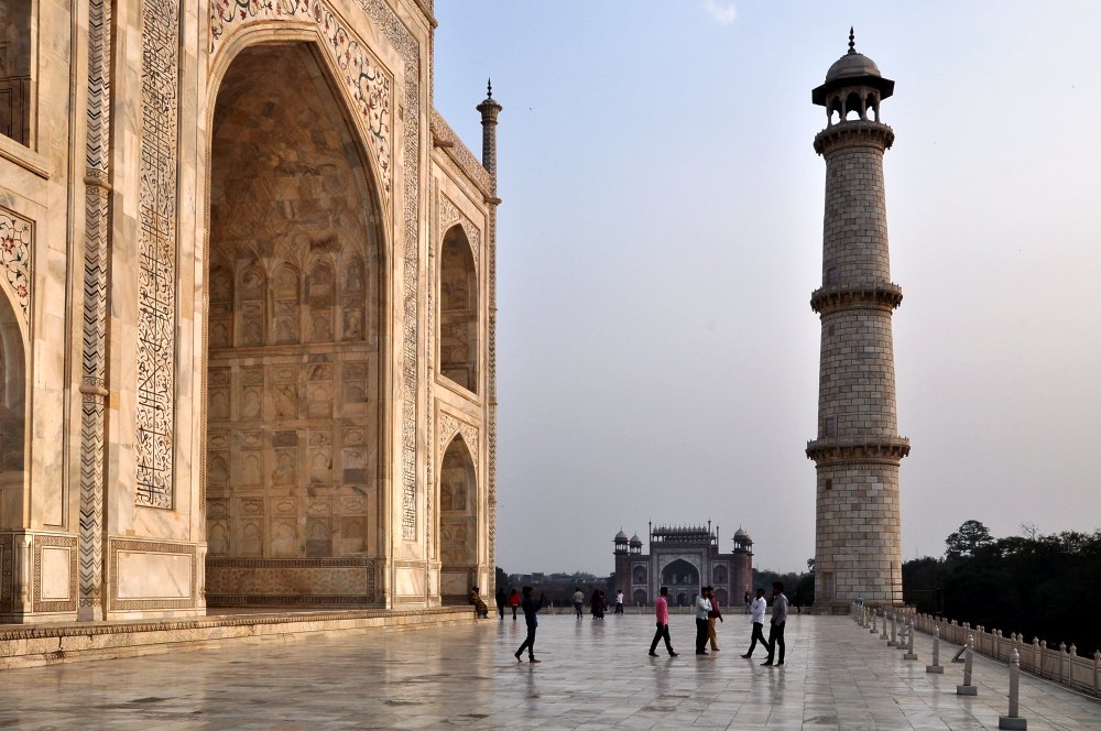 L’entrée ouest du mausolée avec, à droite, le minaret de la façade. En fond, la porte d’entrée et ses clochetons.