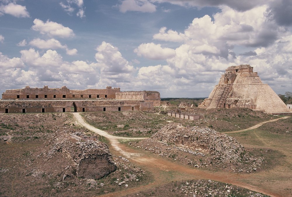 Uxmal. Le site est désert. On paie le parking et on peut aller partout. On peut grimper en haut des pyramides. La chaleur est insupportable. Heureusement il va bientôt pleuvoir... à seaux.