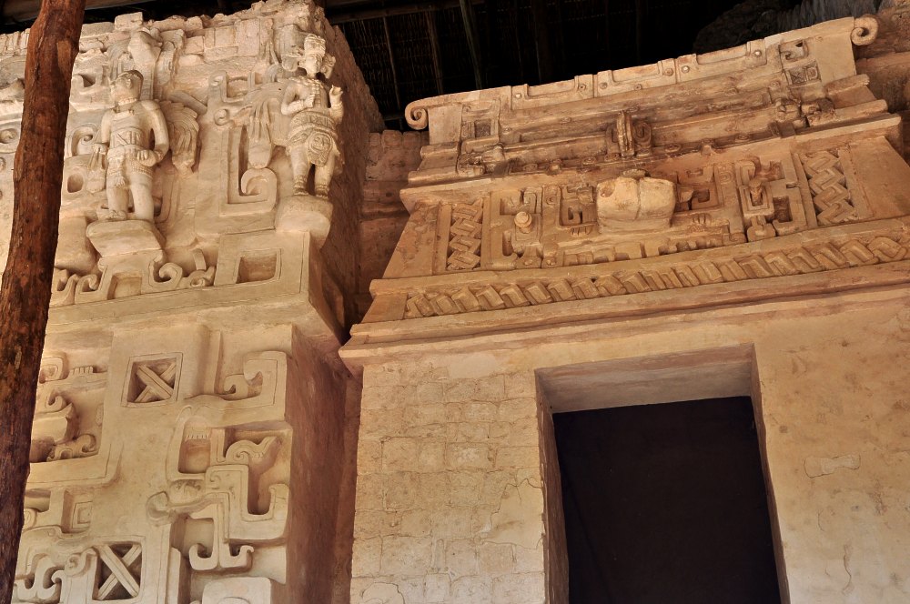 L’encadrement de la porte et les murs latéraux sont décorés de motifs et figures délirantes dont le sens nous échappe. A nouveau on ne peut que penser au site de Copán au Honduras.